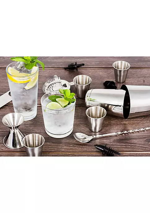 Perfect cocktails every time; stainless steel cocktail tins are designed for a precise fit with easy separation after shaking and accommodates a 2-drink capacity. These double jiggler and 4 shot glasses allow for accurate and consistent measurements. The knobbed cocktail spoon’s long spiraled shaft allows for seamless blending of layered mixed drinks. The bar strainer fits large and standard mixing glasses, while the pourers allow for a smooth, steady, mess-free stream of your favorite liquors and bitters. The accessories nestle in the larger shaker for compact storage and taking it on the go.