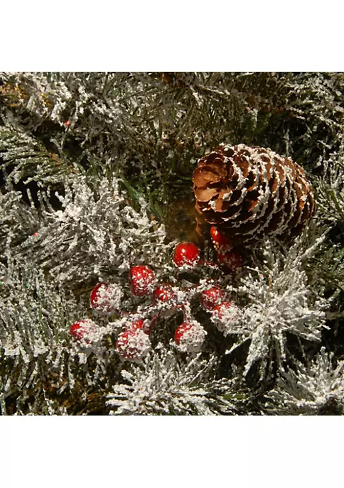 Filled with snow-sprinkled evergreen branches red berries and pine cones