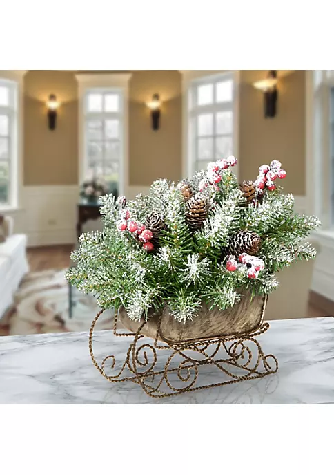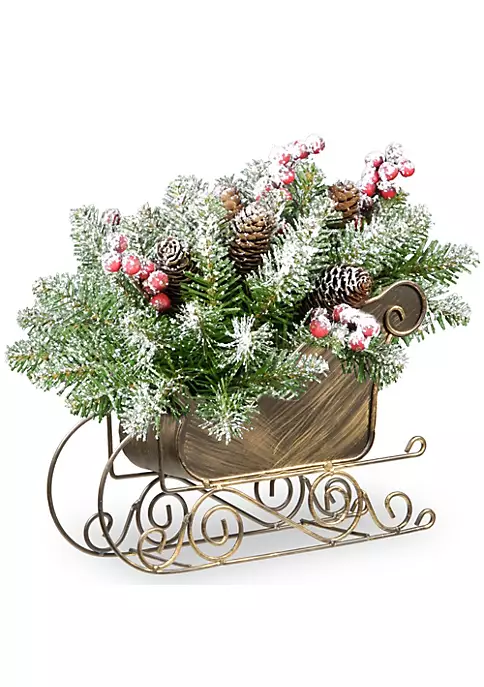 The Dunhill fir sleigh makes an attractive accent piece for your festive decor. The handcrafted sleigh base with the ornate rails filled with snow-sprinkled branches berries and pine cones is pure bliss. It makes a perfect centerpiece for your living area porch or patios.