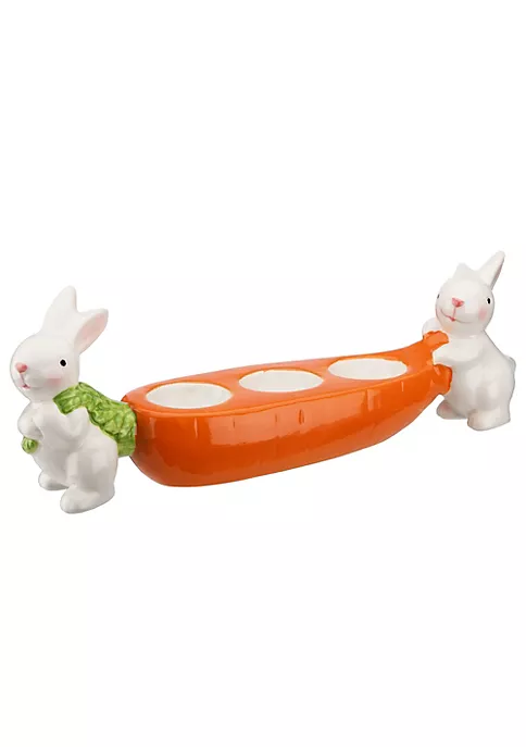 White bunnies bookend the carrot-shaped center