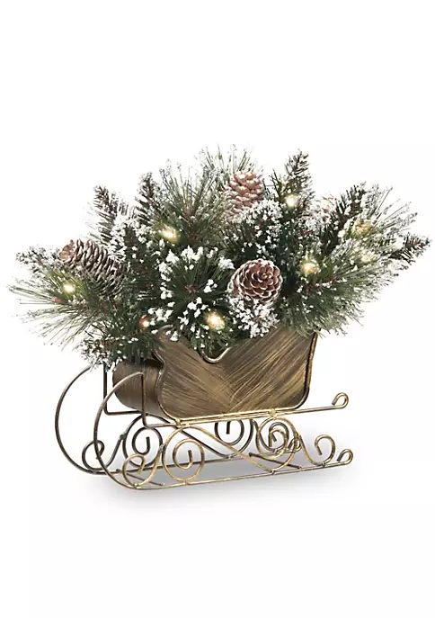 Features a handcrafted metal sleigh base with ornate rails filled with glittered evergreen branch tips