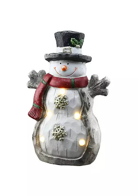 Smiling snowman is wrapped in a cozy cap and scarf and features a wood-look design