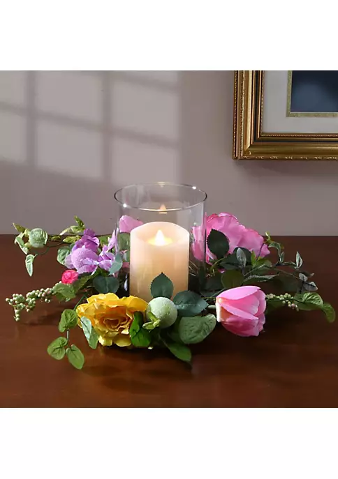 With a Spring flavor this candle holder will make a remarkable Easter addition. Beautifully trimmed with artificial spring flowers berry clusters and decorated eggs it is a sheer visual delight. The base seats the candle enclosure. It makes a perfect tabletop centerpiece and a beautiful gift for your loved ones too.