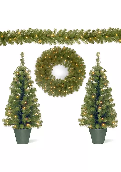 You know the world is your decorating oyster when it’s time for Xmas! Festoon your living space entryway or hallway with this festive assortment. Features entrance trees garlands and a wreath the collection calls for no pruning – means little maintenance! Each piece is pre-lit with lights adding charm to the already festive appeal of them!