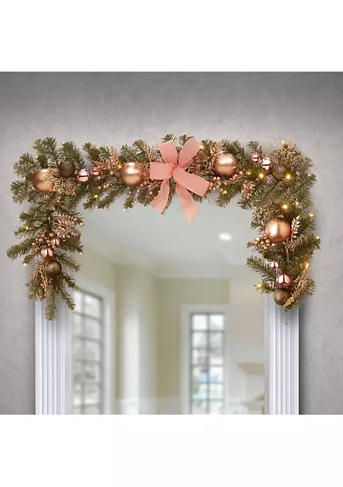 Garland is decorated with warm pink colored leaf sprigs berry clusters ball ornaments and bows