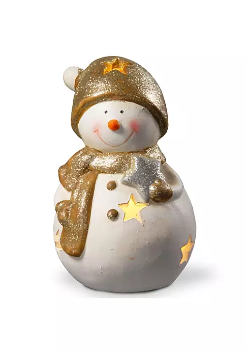 Features snowman decoration with a wide smile and carrot nose is wearing a matching color cap and scarf and is holding a star