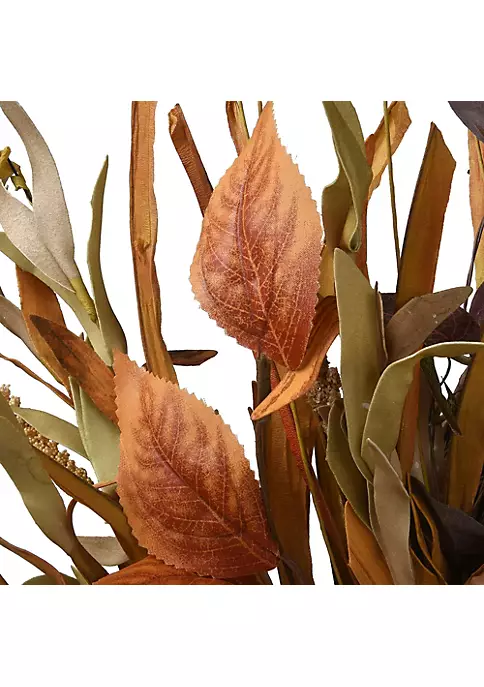 Trimmed with miniature pumpkin gourds and assorted seedpods complete the autumn motif
