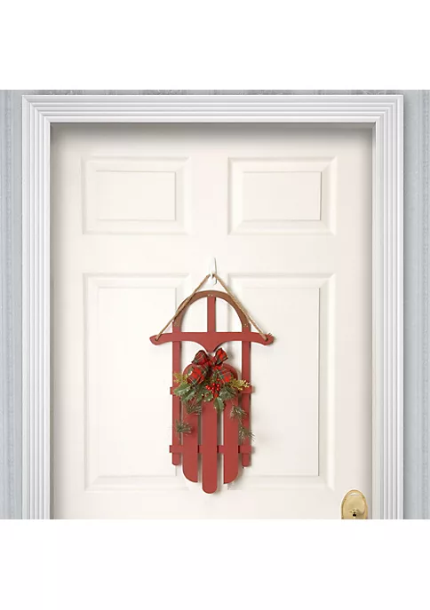 Comes with holly leaves red berries and a plaid ribbon and bow on the sled