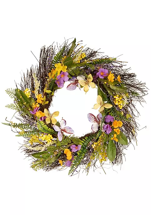 Spread an authenticated spring vibe to your surroundings by hanging this wreath on your doors windows or walls. This round wreath featuring assorted colorful flower blooms leafy greens fern fronds berry clusters and butterflies brings the essence of the season to your space. Everyone who glances at this decor would wish to possess it for their next holiday gathering!