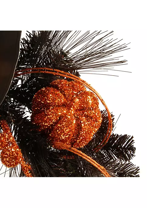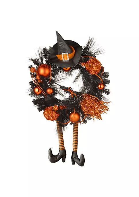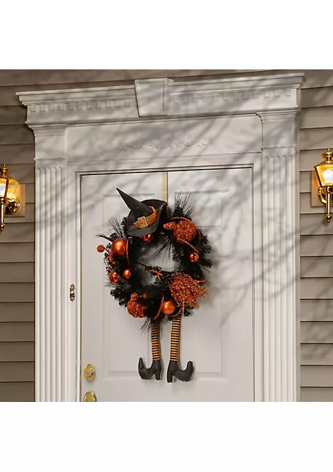 Spread an authenticated Halloween vibe to your surroundings by hanging this wreath on your doors windows or walls. This round wreath featuring an orange-banded witch’s hat and two striped legs with pointed shoes brings the essence of horror to your space. Everyone who glances at this Halloween decor would wish to possess it for their next haunted gathering!