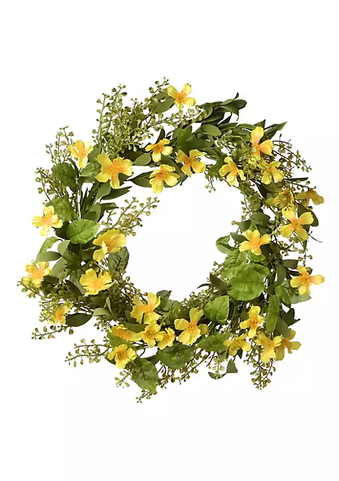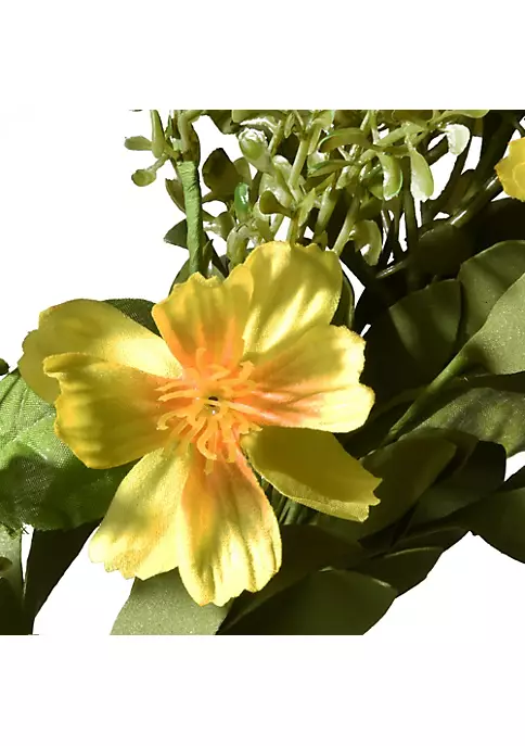 Wreath features bright yellow mini cosmos flower blooms assorted with leafy green stems