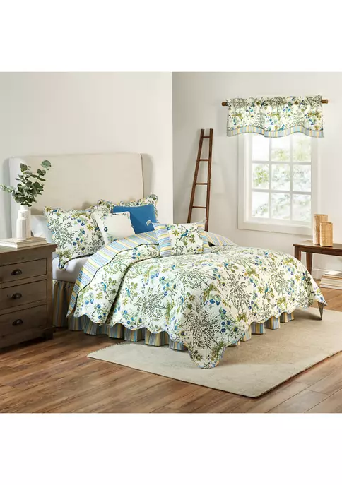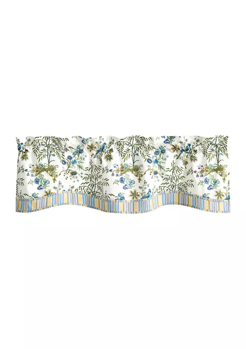 The Above the Trees valance by Waverly® features a striped trim and pretty floral pattern that will add eye-catching appeal to any room.