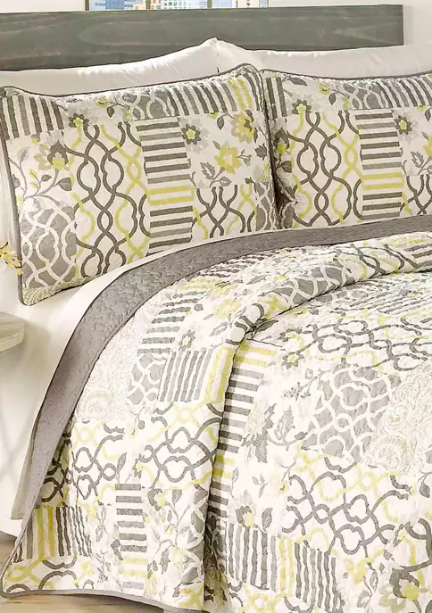 Full/Queen set measures 90 in x 90 in with two 20 in x 26 in shams